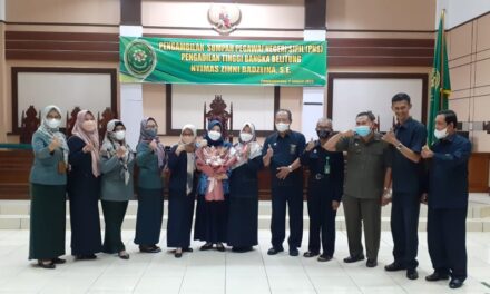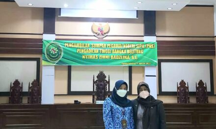 Setelah acara berjalan dengan lancar dan hikmat, kemudian Ketua Pengadilan Tinggi Bangka Belitung memberikan ucapan selamat kepada Nyimas Zihni Badzlina, S.E. Pegawai Negeri Sipil yang baru diambil sumpah dan kemudian dilanjutkan dengan foto bersama.
