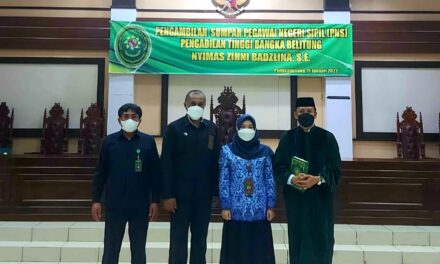 Ketua Pengadilan Tinggi Bangka Belitung YM. Ibu Asnahwati, S.H., M.H. melantik dan melakukan pengambilan sumpah PNS kepada Calon Pegawai Negeri Sipil menjadi Pegawai Negeri Sipil (PNS) pada hari Selasa, 11 Januari 2022 berlangsung di Ruang Sidang Utama Pengadilan Tinggi Bangka Belitung
