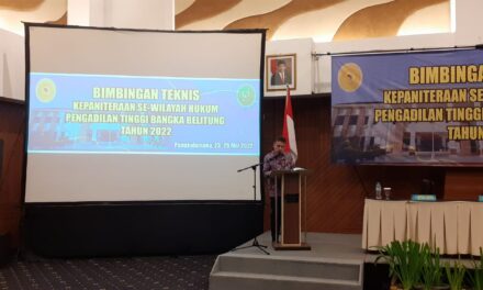Pengembangan kompetensi ASN di bidang Kepaniteraan pada Pengadilan Tingkat banding dan Pengadilan Tingkat Pertama sewilayah hukum Pengadilan Tinggi Bangka Belitung tersebut berlangsung selama 3 (Tiga) hari pada tanggal 23 Mei sampai dengan 25 Mei 2022 di Hotel Santika Bangka Jalan Soekarno Hatta (Jalan Raya Koba) KM 5 No.17, Kampul Dul Kec. Pangkalan Baru, Pengadilan Tinggi Bangka Belitung melaksanakan kegiatan Bimbingan Teknis ( BIMTEK ) dengan tema “SIPP-IT, Biaya Perkara, E-Litigasi (e-court), SIPP dan SPPT-TI”.