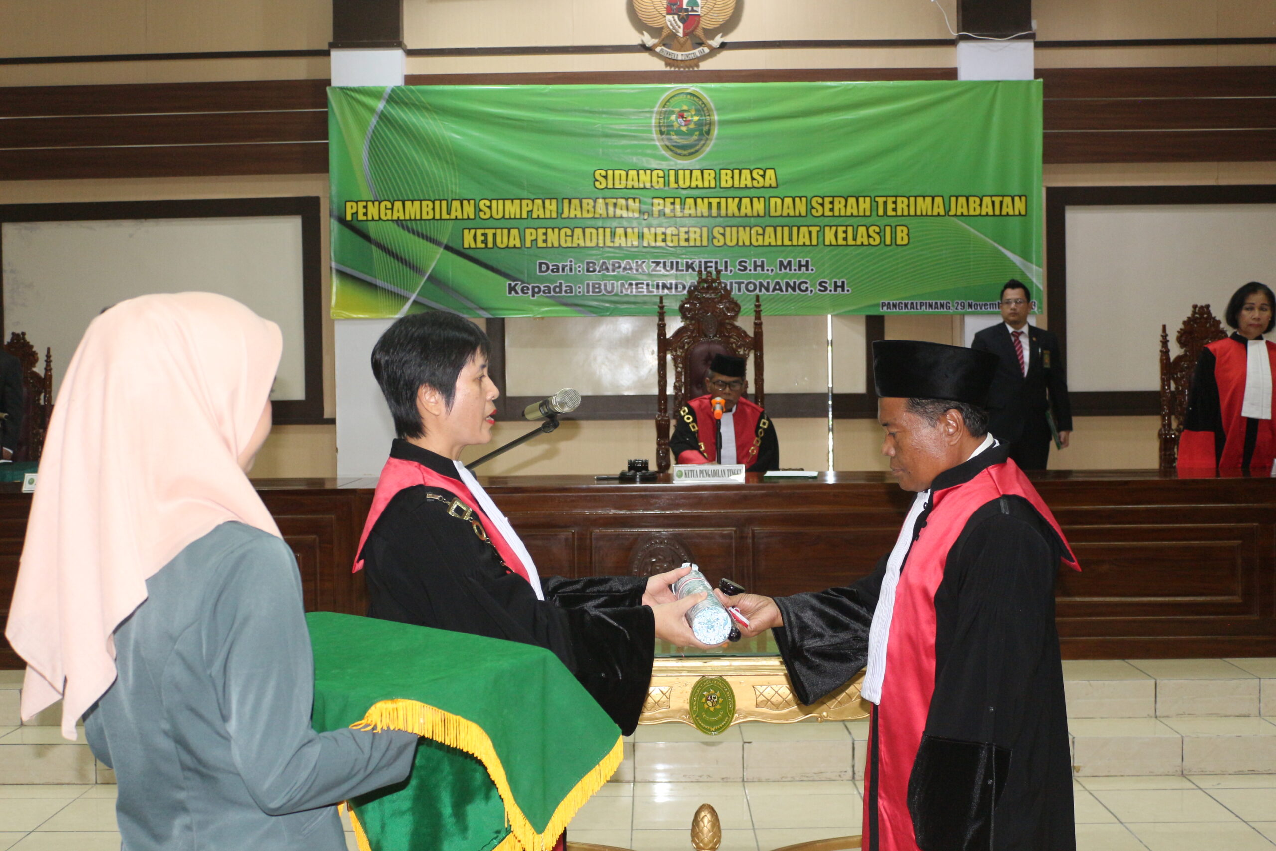 Bersamaan dengan acara pelantikan juga diikuti dengan Serah Terima Jabatan oleh Bapak Zulkifli, S.H., M.H selaku Ketua Pengadilan Negeri Sungailiat sebelumnya. Tidak lupa, Ketua Pengadilan Tinggi beserta seluruh hadirin mengucapkan selamat kepada Ibu Melinda Aritonang, S.H atas promosi jabatan barunya sebagai Ketua Pengadilan Negeri Sungailiat.