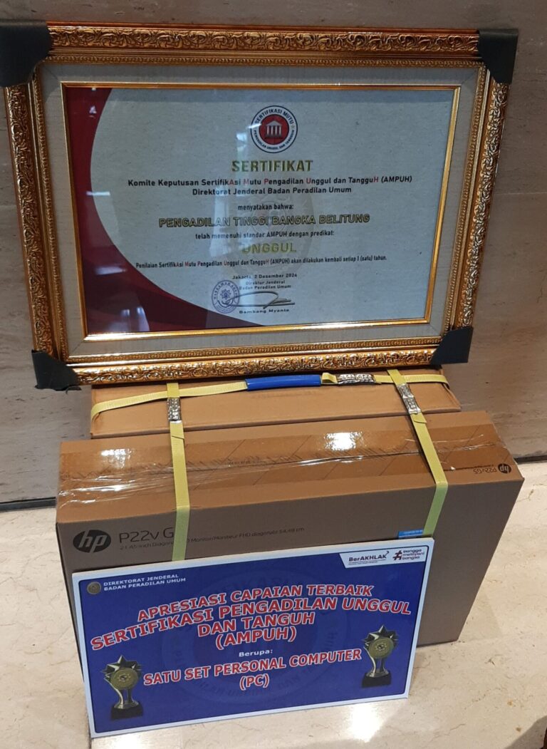 Pengadilan Tinggi Bangka Belitung berhasil menerima 2 (dua) Piagam Penghargaan yaitu Urutan ke 7 sertifikat AMPUH Berpredikat Unggul dari seluruh Pengadilan Tinggi Seluruh Indonesia dengan perolehan nilai 899, 41 dan urutan pertama Evaluasi Implementasi SIPP (EISS).