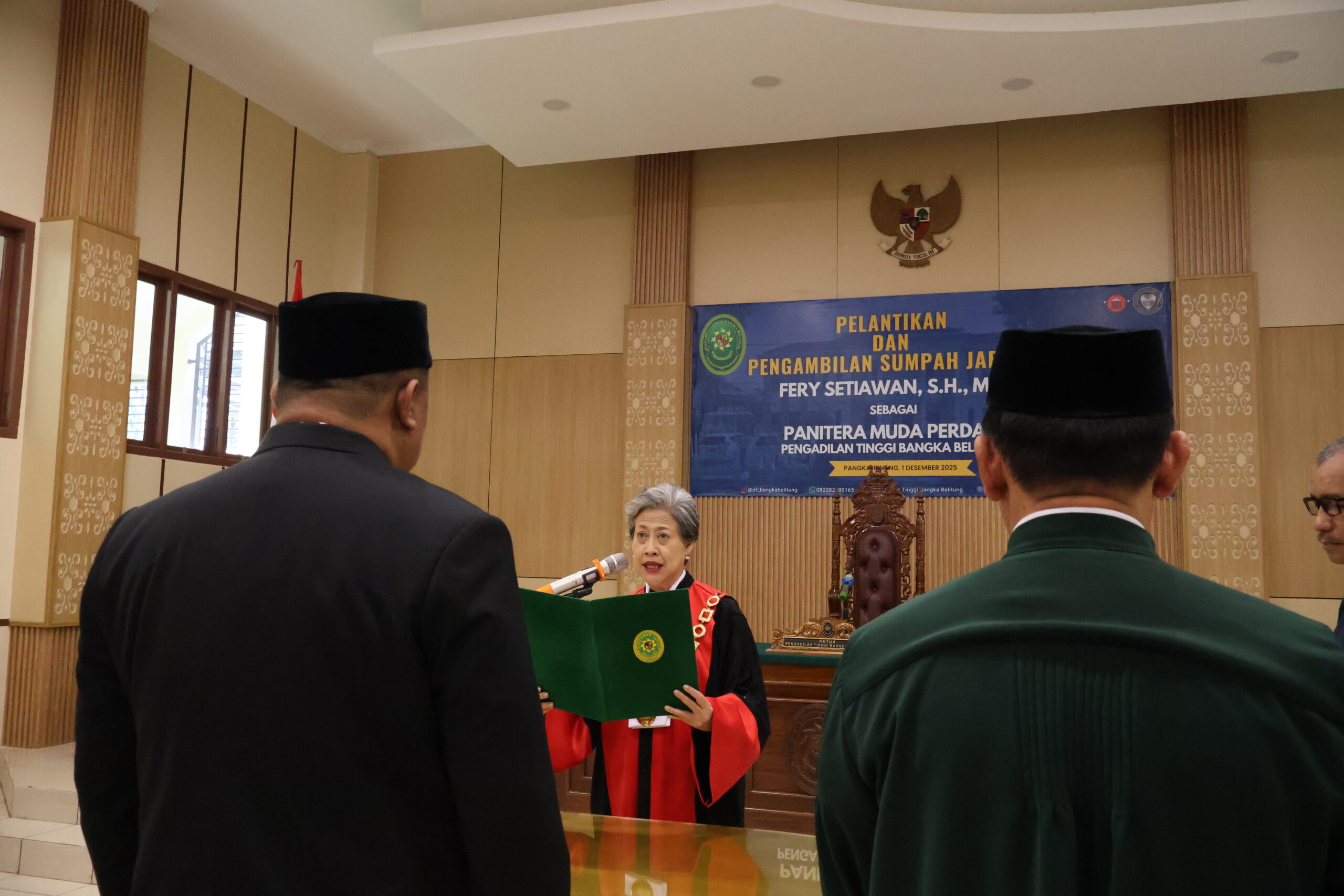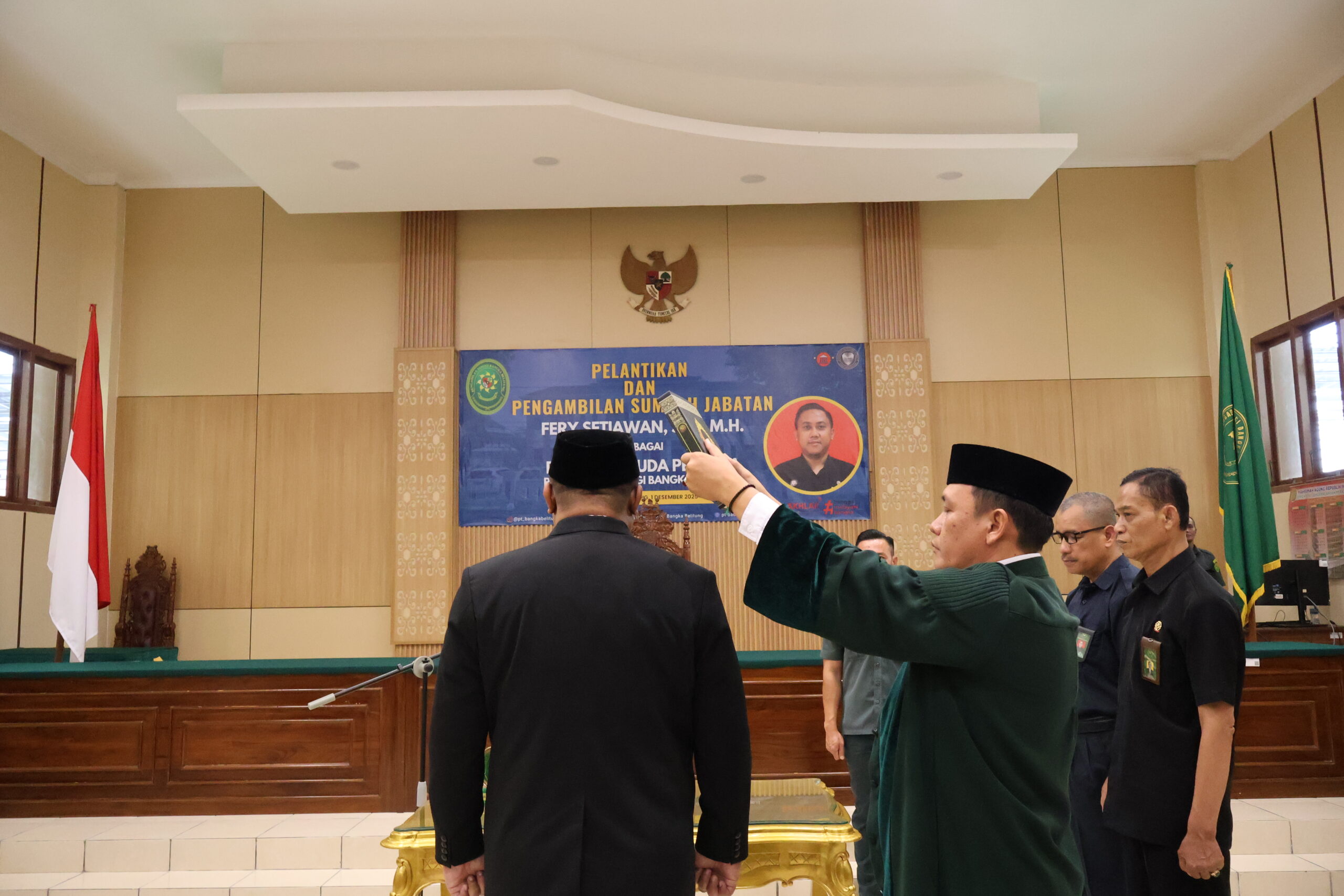 Upacara diawali dengan pembacaan Surat Keputusan Ketua Mahkamah Agung Republik Indonesia tentang pengangkatan Sdr. Fery Setiawan, S.H., M.H. Prosesi inti dilanjutkan dengan pengambilan sumpah jabatan sesuai agama yang dianut, didampingi oleh rohaniwan, dan diakhiri dengan penandatanganan Berita Acara Pelantikan. KPT Bangka Belitung, Dr. Artha Theresia, S.H., M.H., secara simbolis menyematkan tanda jabatan kepada pejabat yang baru dilantik. Dalam sumpah jabatan tersebut, Bapak Fery Setiawan berjanji untuk menjalankan tugas dan wewenangnya sebagai Panitera Muda Perdata dengan jujur, seksama, dan tidak membeda-bedakan orang, serta akan memegang teguh rahasia negara dan jabatan.
